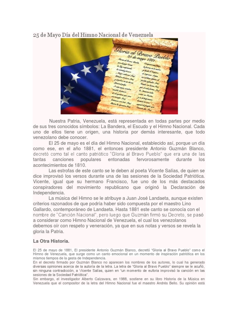 Efemerides De Venezuela from image.slidesharecdn.com El dia del himno de venezuela es el 25 de mayo. Himno nacional de venezuela en wayuunaiki. El himno nacional de venezuela tiene un mensaje muy claro: Dandole la bienvenida a los niños venezolanos, y haciendo la promesa de que se les enseñará el himno peruano poco a poco. El 25 de mayo de 1881, el presidente antonio guzmán blanco, decretó gloria al bravo pueblo como el himno de venezuela, que surge como un canto emocional en un momento de inspiración patriótica en los mismos tiempos de la gesta de independencia. Himno nacional de venezuela, caracas, venezuela. Un coro idéntico, repetido al principio y al final de la cancion, y entre las estrofas. Dibujos para pintar día del himno nacional.